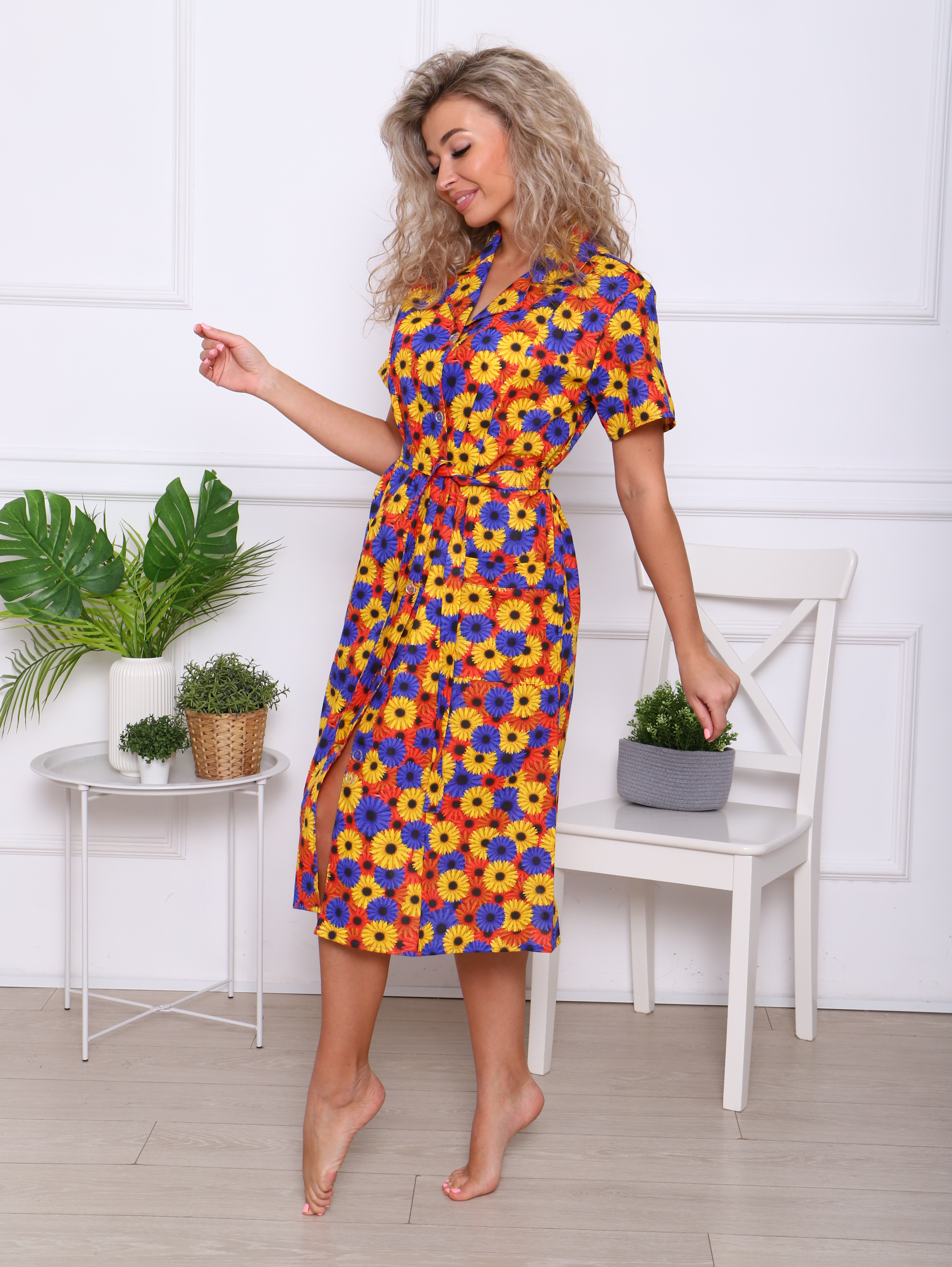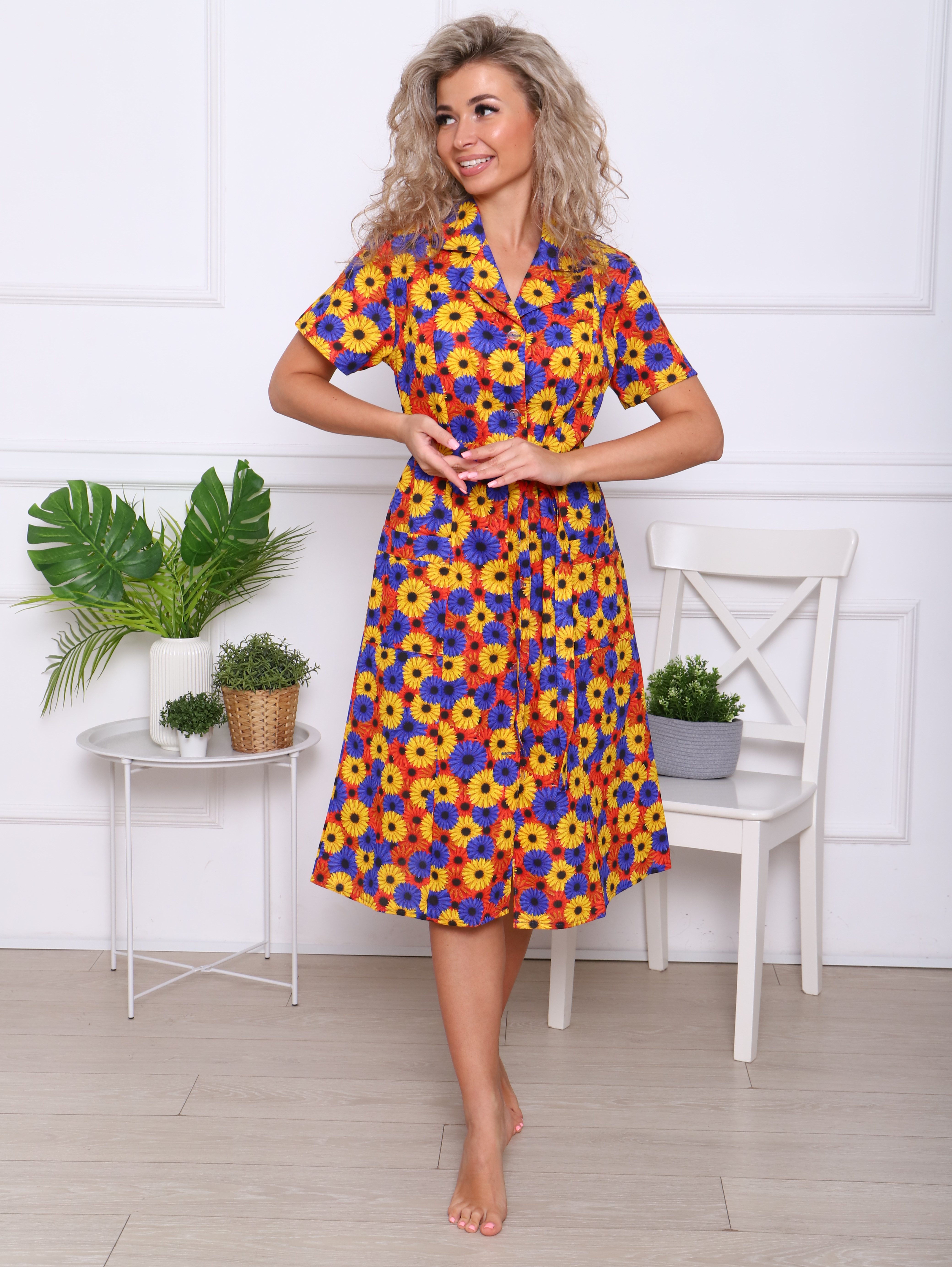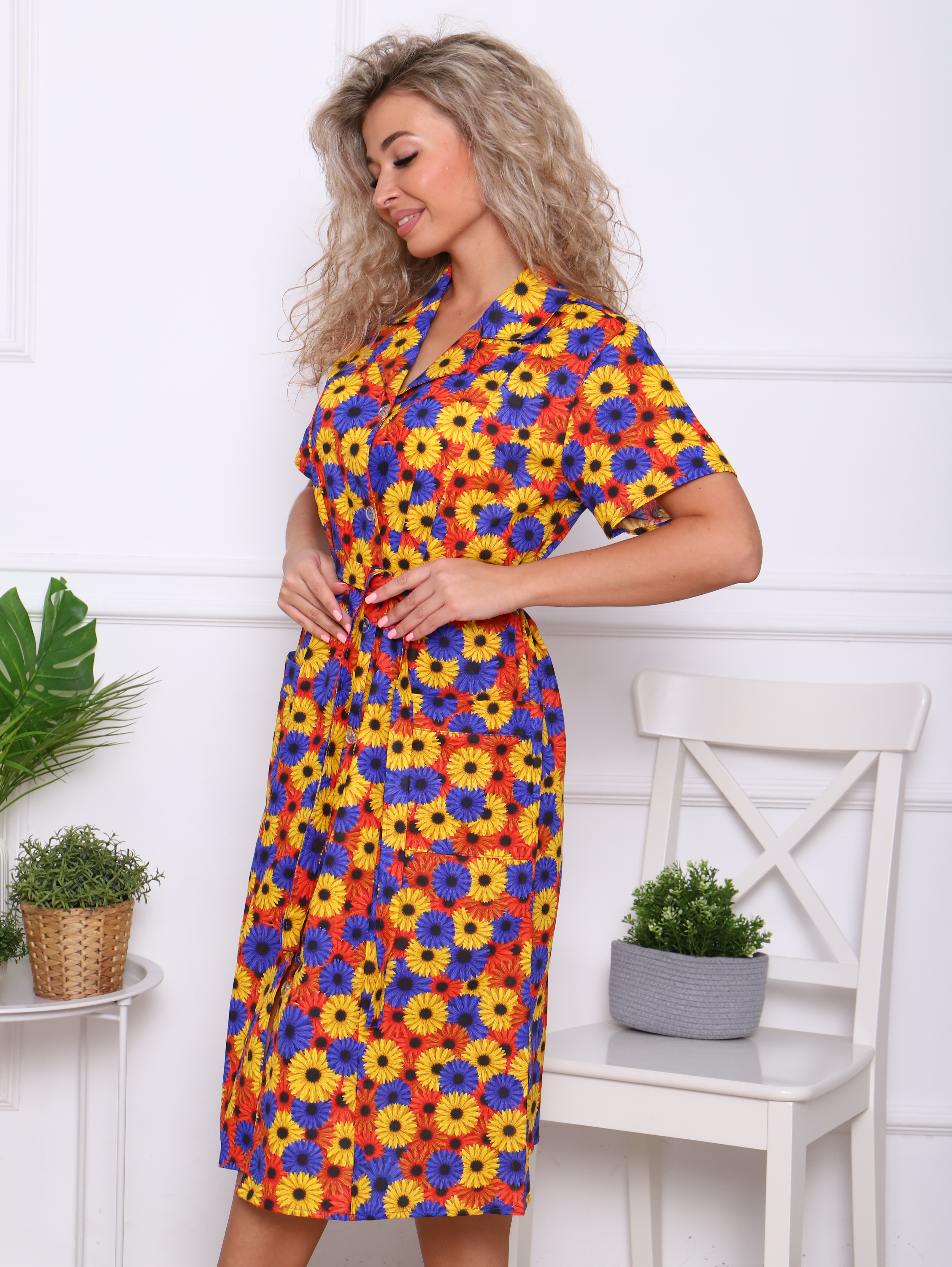 Халат домашний летний бязевый на пуговицах,  с накладными карманами и втачным коротким рукавом, выполнен из натурального хлопчатобумажного материала 100% хлопок.